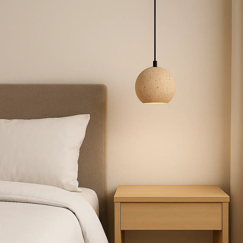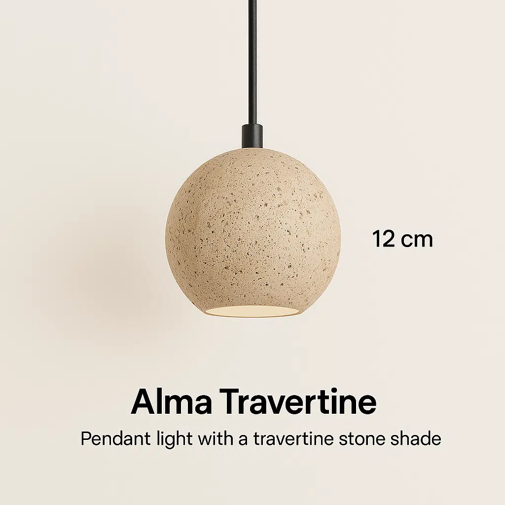 גוף תאורה תלוי בעיצוב טבעי ומעודן, המשלב בין אבן, אור וחומר – ליצירת אווירה רגועה, חמימה ועל-זמנית.
