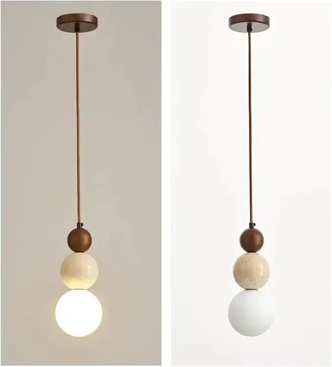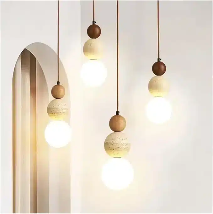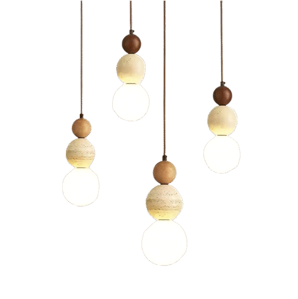 גוף תאורה תלוי בעבודת יד, המשלב כדורי Travertine טבעיים עם כדור עץ וחיפוי זכוכית חלבית.
