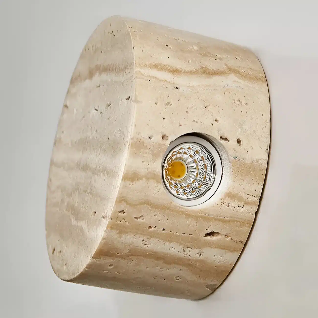 גוף תאורה קיר מינימליסטי עשוי אבן טרוורטין טבעית, המשדר יוקרה טבעית ואלגנטיות נצחית.