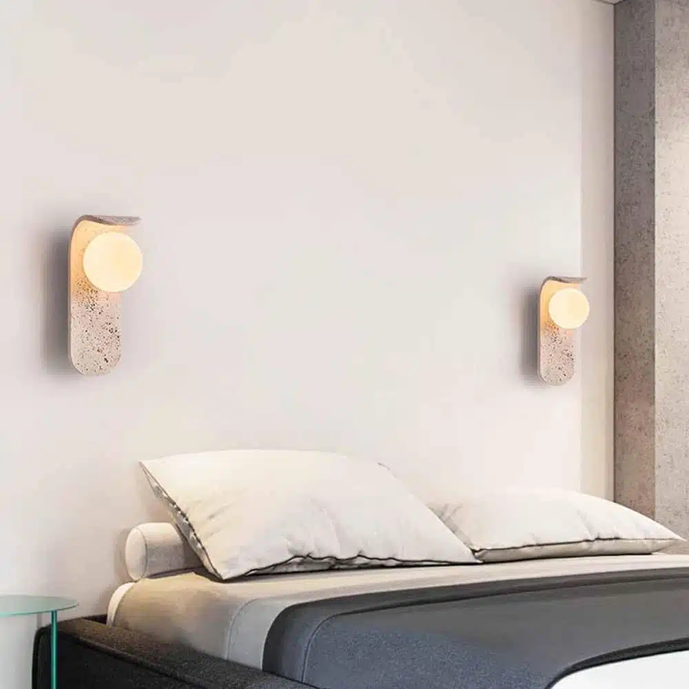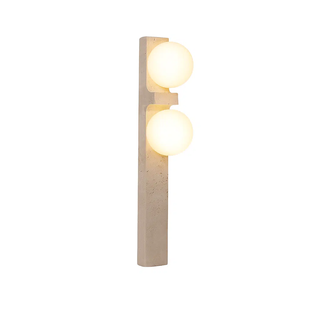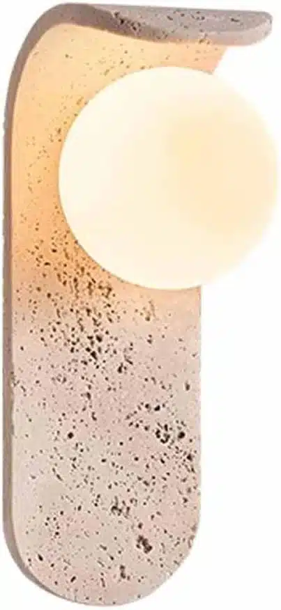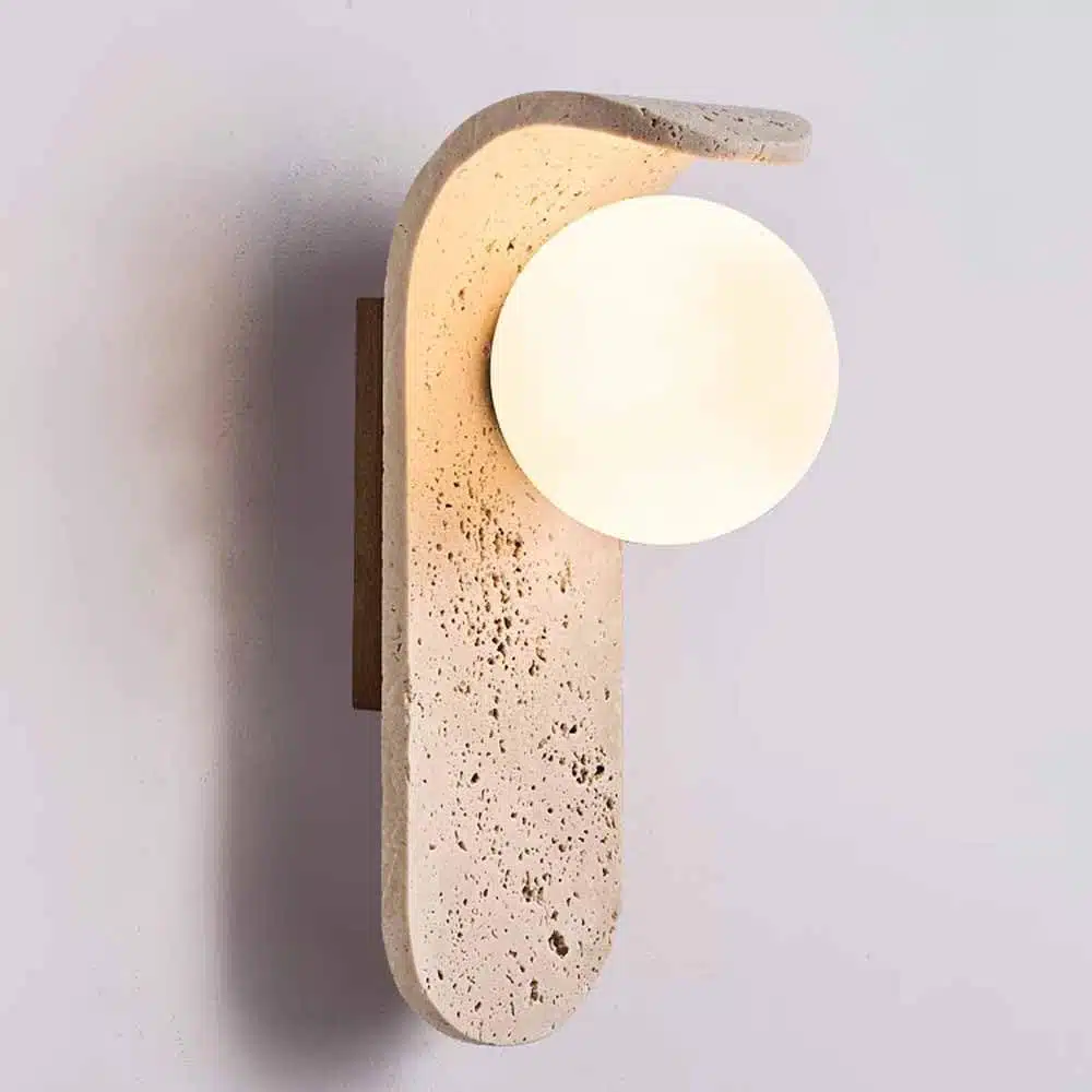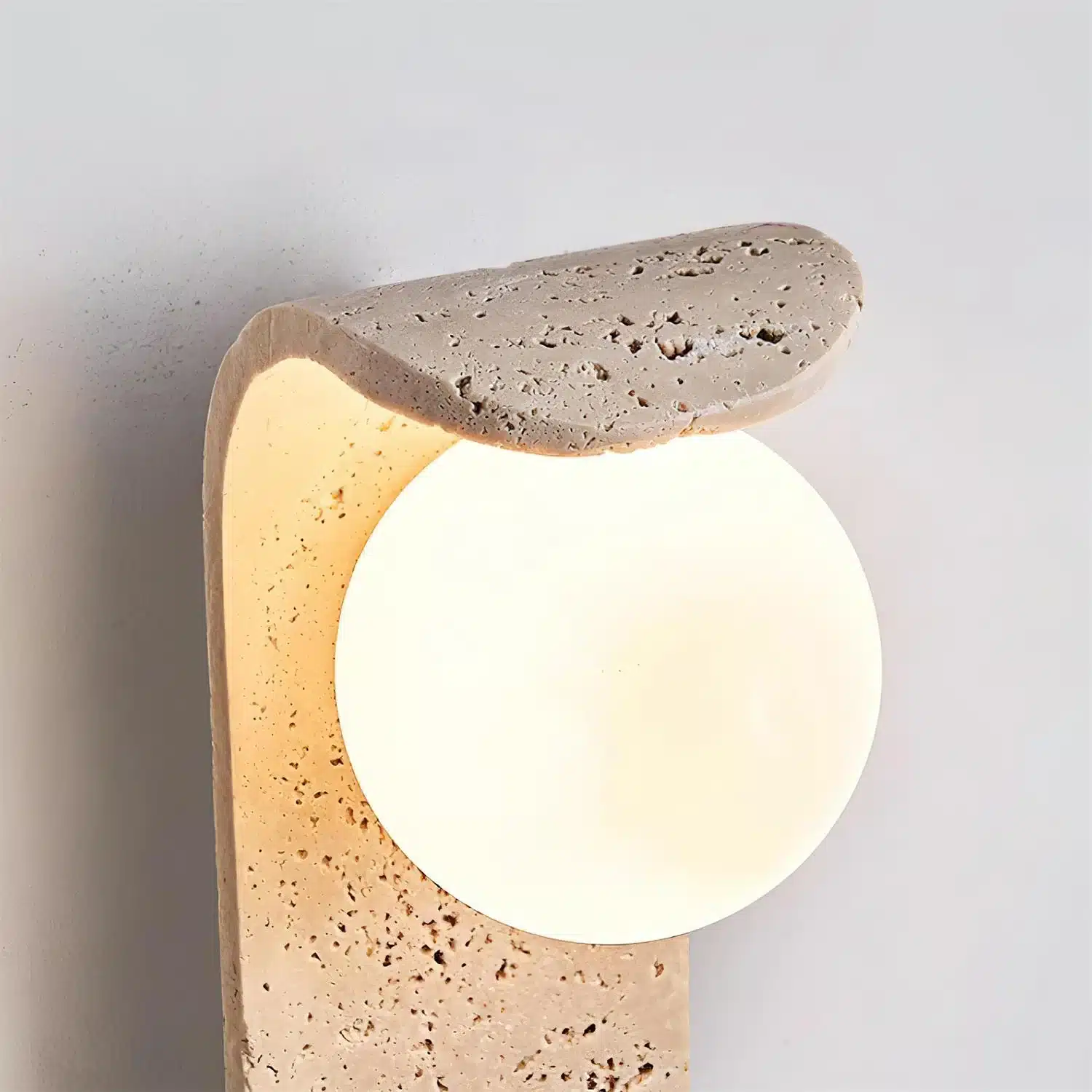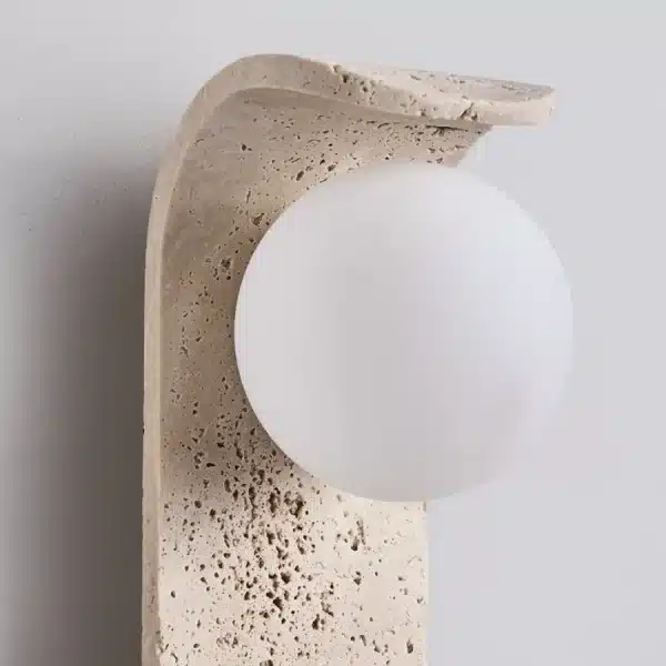 גוף תאורה קיר דקורטיבי בעיצוב טבעי ומודרני, המשלב אבן טרוורטין טבעית עם כדור זכוכית חלבית ליצירת משחק ייחודי בין אור לחומר.