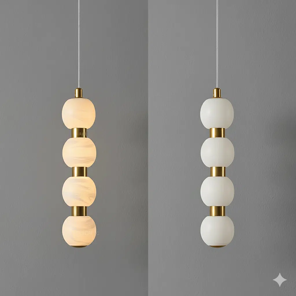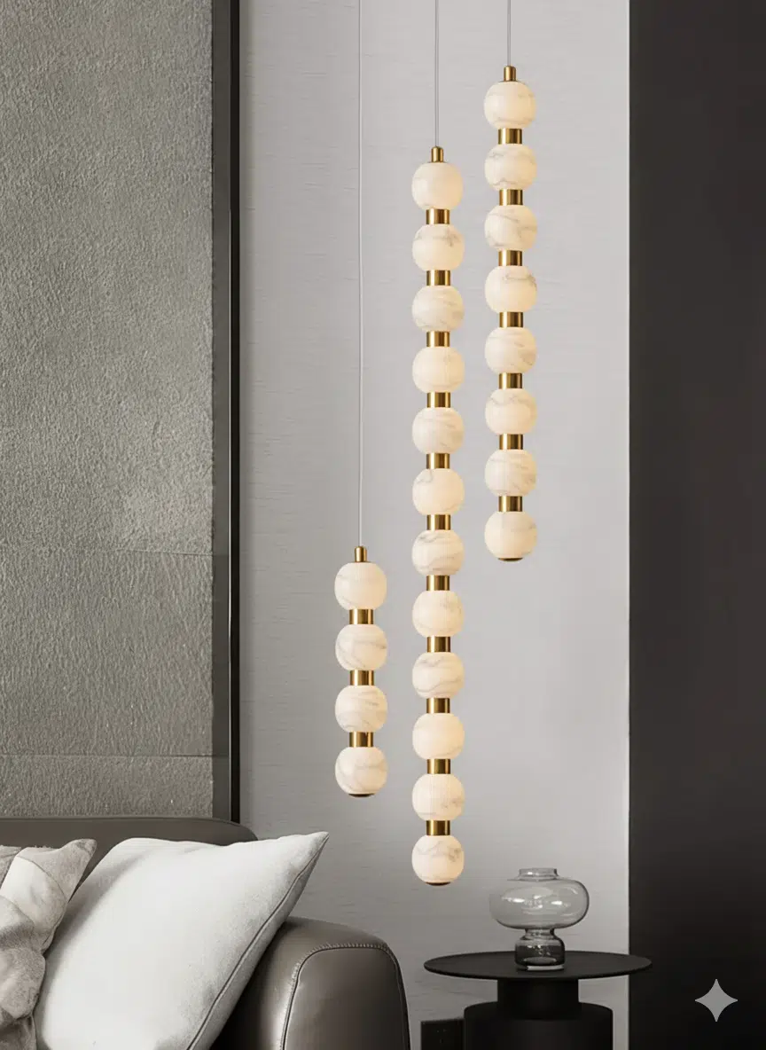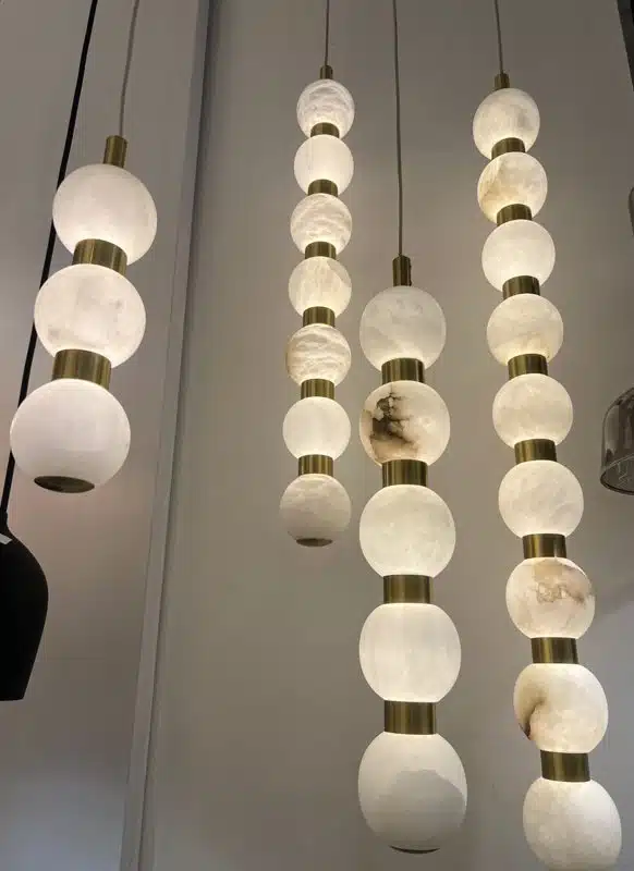 גוף תאורה תלוי מאלבסטר טבעי, בעל כדורי שיש מלא המפיצים אור חם ורך ויוצרים מראה יוקרתי ונקי.