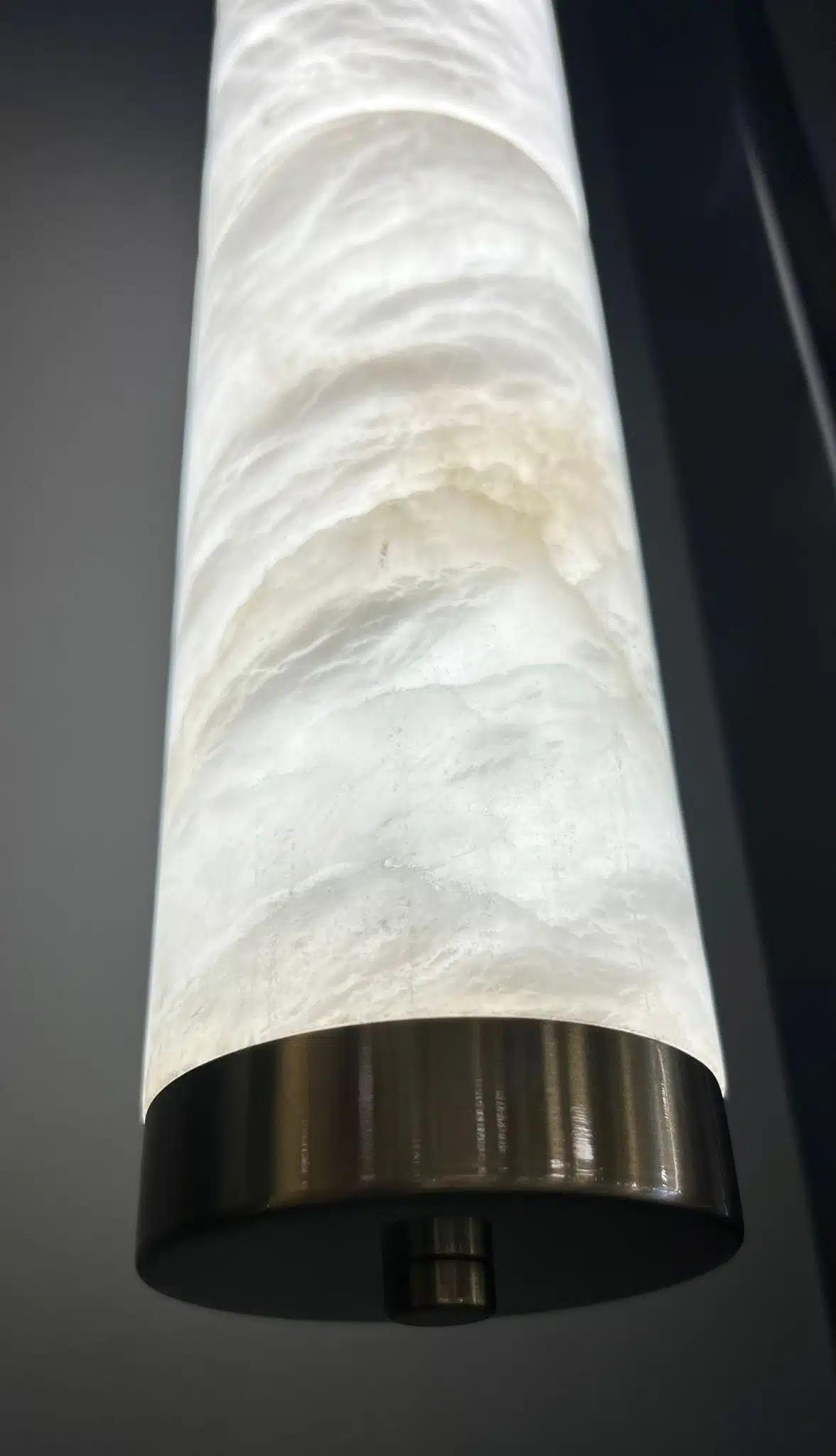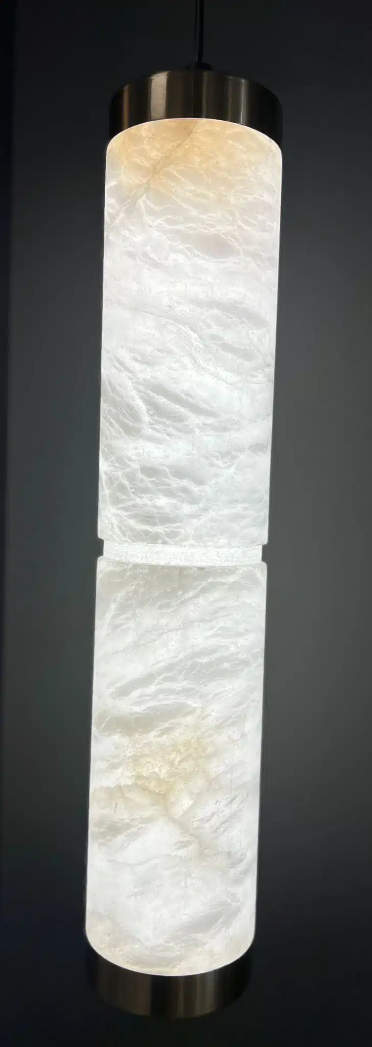 גוף תאורה מדמה צילנדר תלוי שכולו משיש בשילוב של פליז בגימורים למראה מרשים ויוקרתי.