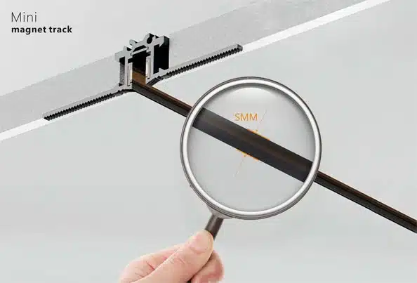 הפרופיל שבתמונה הוא פרופיל ההתקנה הראשי של מערכת Micro Track – פס מגנטי דק במיוחד (0.5 ס"מ) המהווה את התשתית לכל גופי התאורה המתחברים אליו.