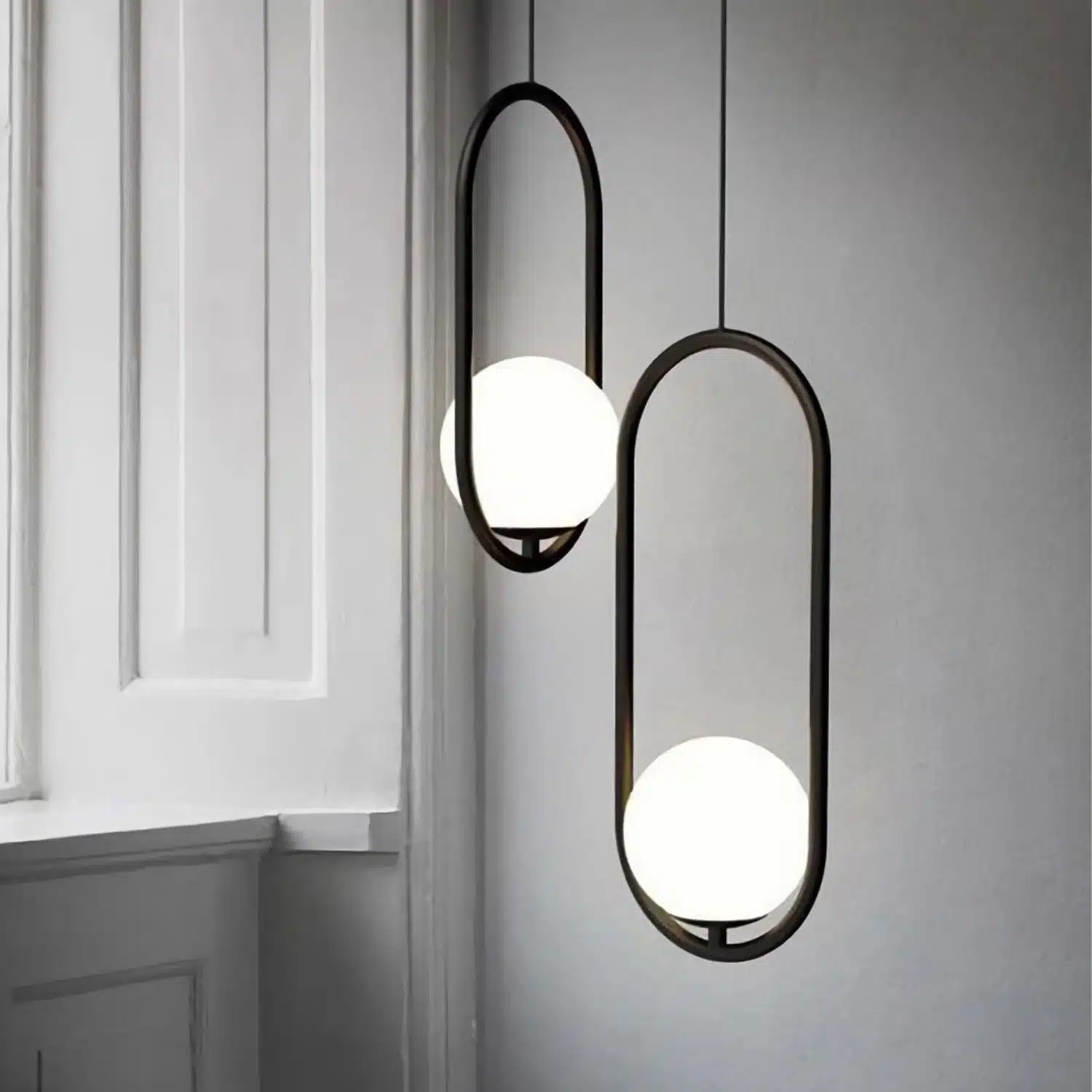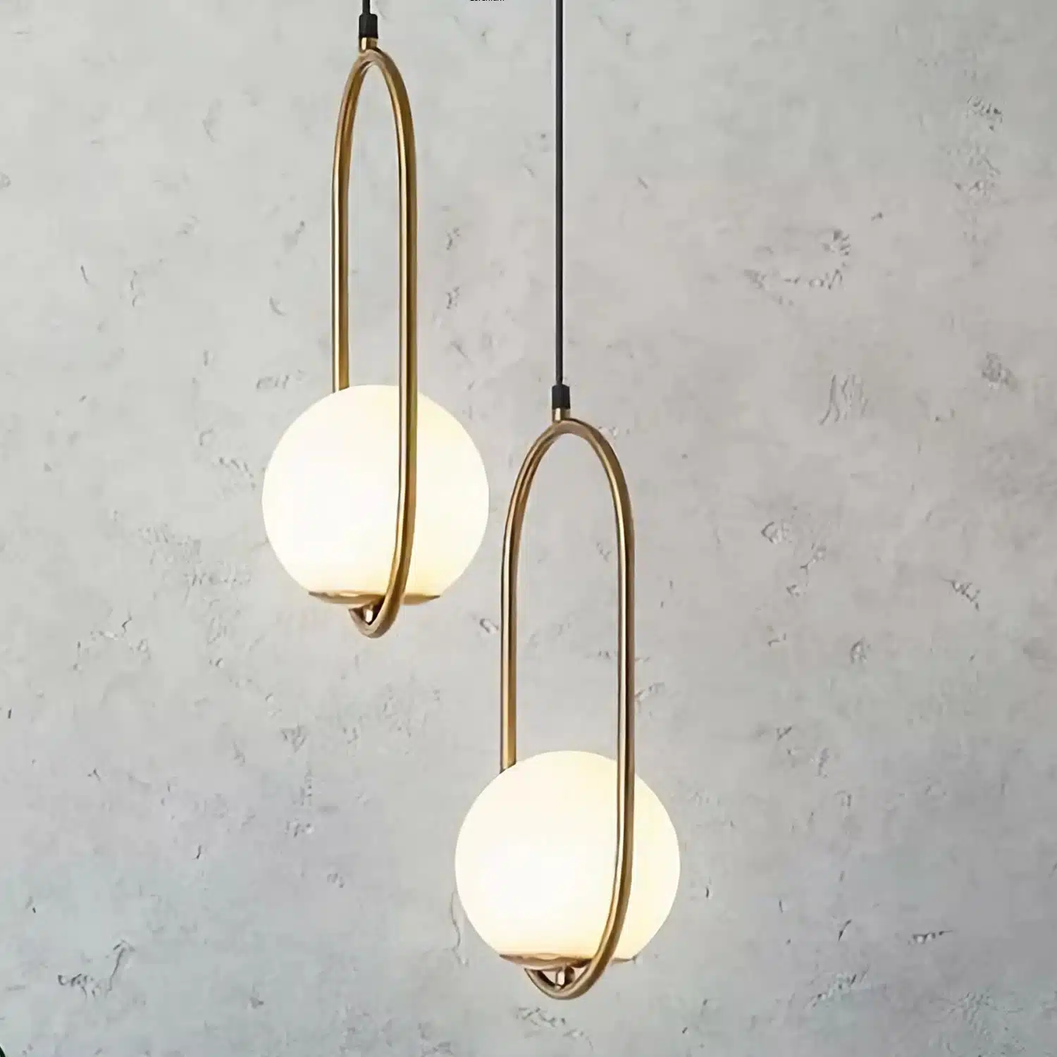 גוף תאורה תלוי, אלגנטי ומעוצב בקווים רכים ונקיים, עם מסגרת מתכת בגוון זהוב וכדור זכוכית חלבית שמפיץ אור חמים ונעים.