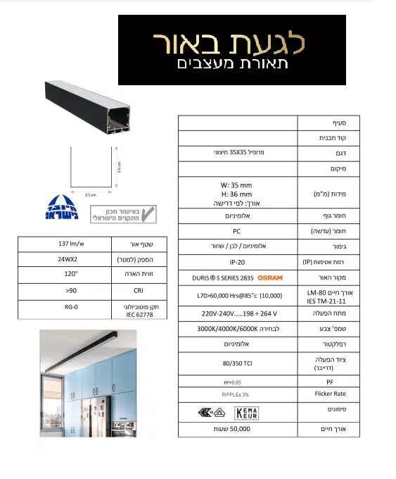 אורך: בהתאמה אישית עד 3 מטר ליחידה (אפשרות לחיבור מקטעים)